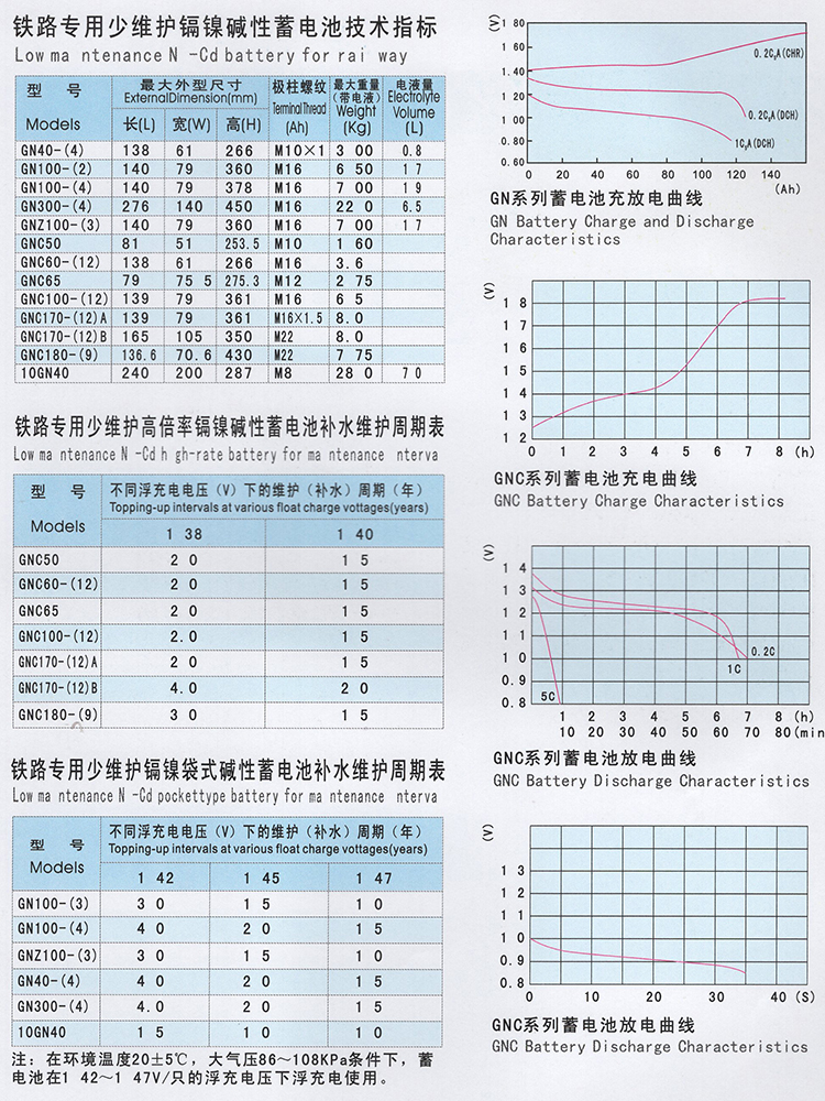 鐵路專用少維護(hù)鎘鎳堿性蓄電池采用了閥控式氣塞,使電池內(nèi)部保持一定的正壓力,防止電解液吸收二氧化碳及電解液中水的自然揮發(fā),保證了蓄電池在整個使用過程中不需要更換電解液。具有壽命長、結(jié)構(gòu)堅固、自放電小、耐過充過放電、使用溫度范圍廣、可靠性高等優(yōu)點。蓄電池在不同電壓下浮充使用時,1~4年不需維護(hù)(視浮充電壓而定)